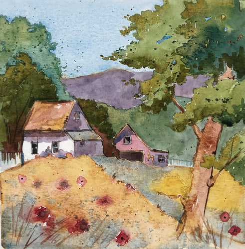 Watercolor Study - Field of Flowers and Farmhouse